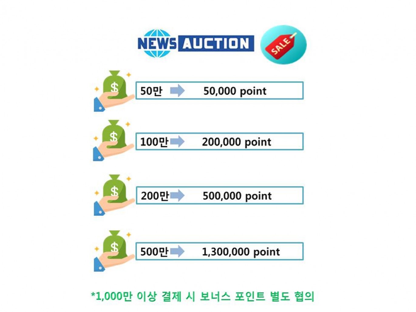 안녕하세요 확실한 언론홍보를 돕고 있는 뉴스옥션 입니다^^ 포인트 제도에 관련된 문의가 많아서 다시 한번 말씀드리겠습니다. 저희는 신규 회원가입 시 20,000 포인트를 증정해드리고 있으며, 구매 금액별로 보너스 포인트를 지급하고 있습니다. 50만 포인트 결제 시 -> 50,000 포인트 증정 100만 포인트 결제 시 -> 200,000 포인트 증정 200만 포인트 결제 시-> 500, 000 포인트 증정 500만 포인트 결제 시 -> 1,300,000 포인트 증정 1000만 포인트 부터는 별도 협의 보너스 포인트 제도를 운영해 최대한 많은 혜택을 고객님들에게 드리기 위해서 노력하고 있습니다. 참고 부탁드리겠습니다. |